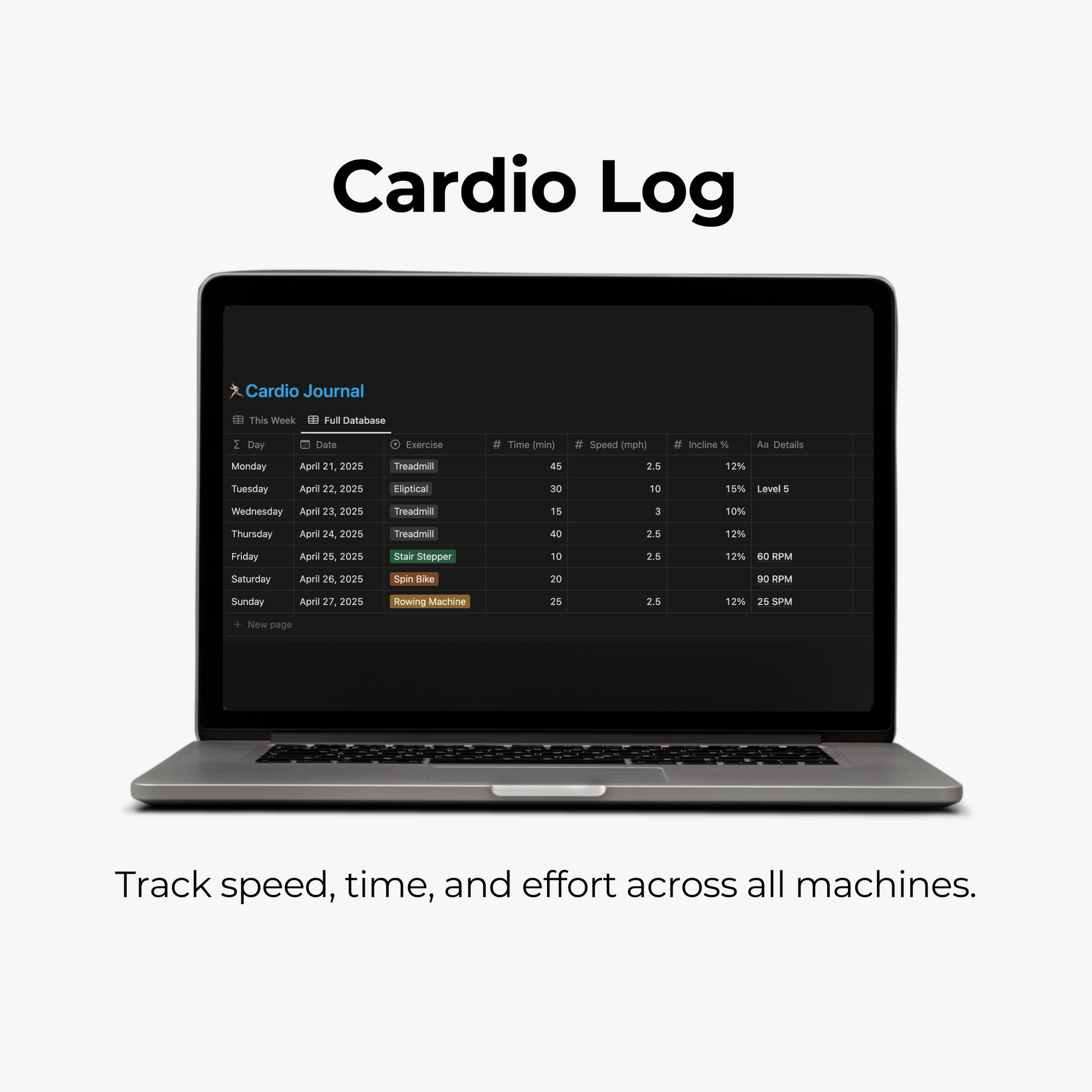 Cardio Tracker – Record your runs, rides, or conditioning sessions with clarity.